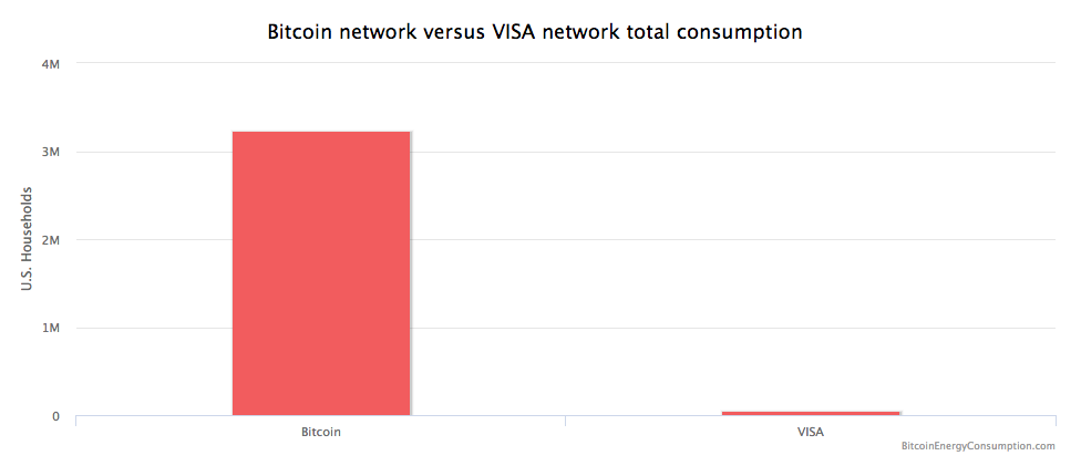 Mining Bitcoin is currently using more energy consumption than entire countries like Denmark, Serbia, and Belarus. The carbon footprint that therefore accompanies a Bitcoin transaction is massive. Just look at the chart below at the difference in energy consumption between Bitcoin and payments competitor VISA.