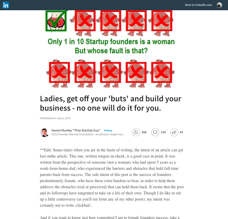 Yesterday the Sydney Morning Herald published an article authored by management consultant Kasey Edwards, Bro-culture is insidious in start-up world, and it keeps women on the outer, in which she referred to a LinkedIn post by a gentleman named Daniel Mumby, aka ‘That Startup Guy’, titled Ladies, get off your ‘buts’ and build your business – no one will do it for you.