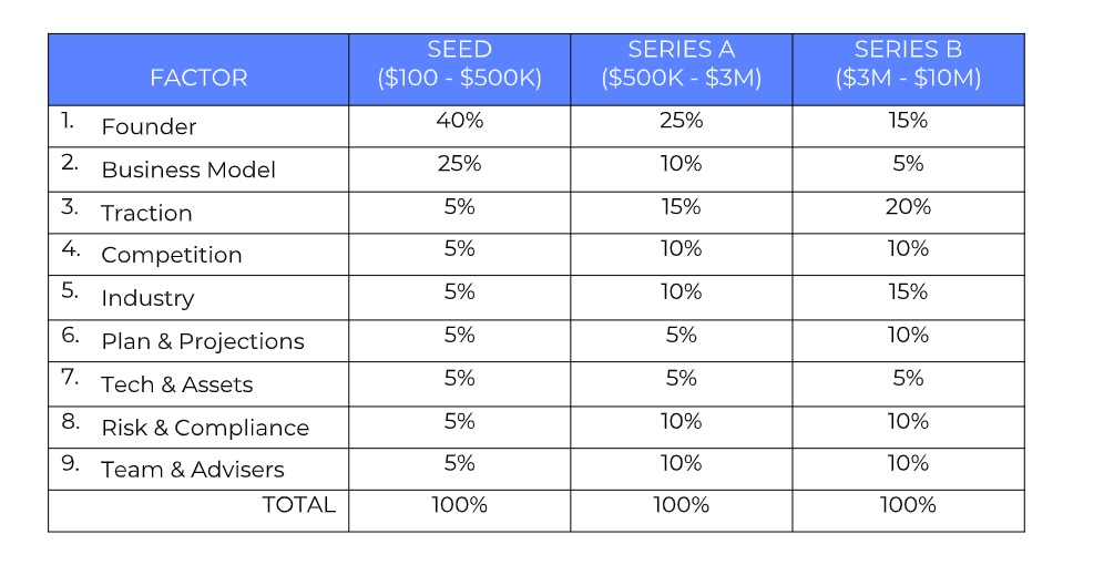 For Series A or Series B rounds, the weighting shifts more toward the traction and is more evenly spread across other factors such as the industry, competition, risk, projections and team.