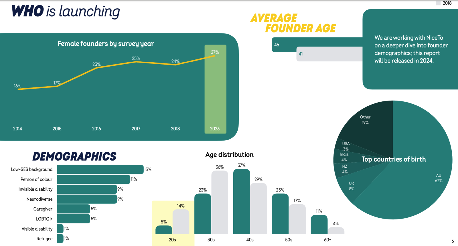 Nearly two-thirds (62%) of founders were Australian by birth, followed by the UK (8%), and NZ and India (4%).