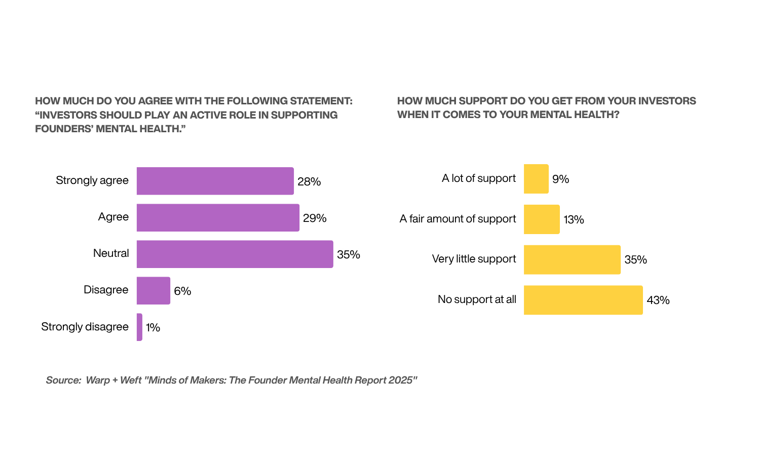 The result? 78% of founders with equity investors receive little to no mental health support. We’re talking about 42% getting zero support whatsoever.