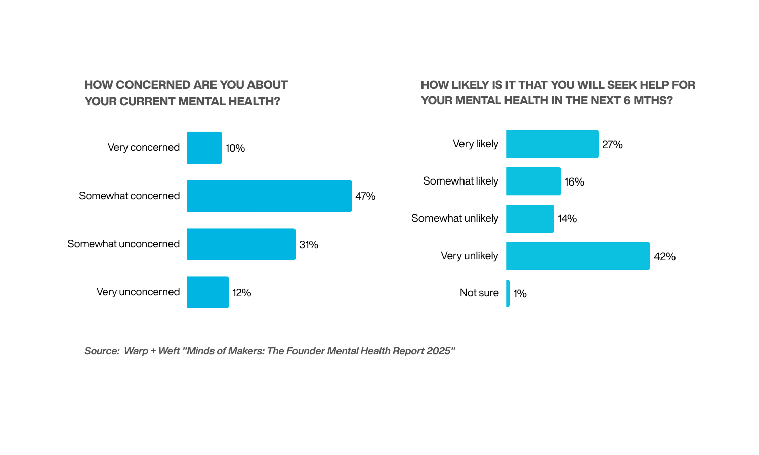 The disconnect is stark: 56% of founders are unlikely to seek mental health support in the next six months, despite 57% being concerned about their current mental state.