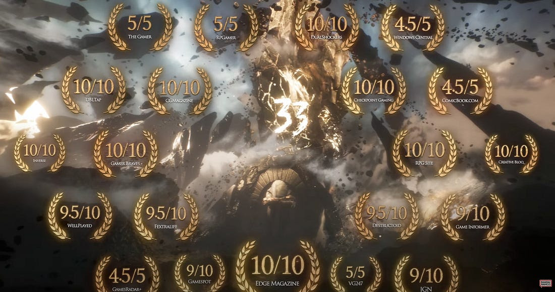 A screenshot of Clair Obscure: Expedition 33’s accolades trailer, showing how game scores are used in marketing.