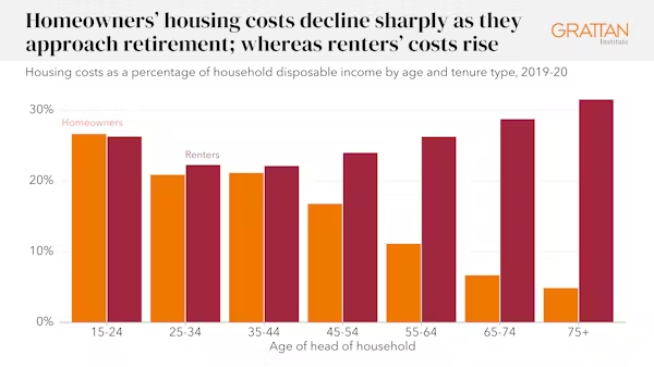 Notes: Housing costs include mortgage interest and principal repayments and general rates for homeowners, and rental payments for renters. Does not include imputed rent. Grattan analysis of ABS (2022) Survey of Income and Housing.