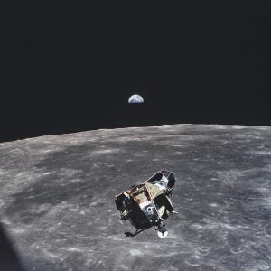 Russian cosmonaut Anton contemplates US astronaut Michael Collins’ iconic photograph of Apollo 11 leaving the surface of the Moon in 1969 with the Earth beyond.