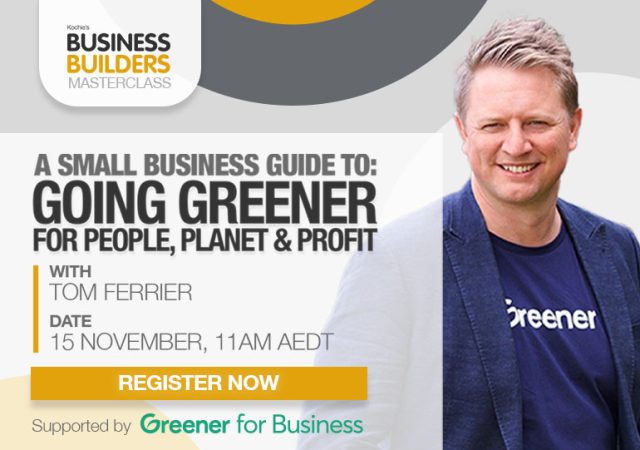 Next Wednesday, November 15, from 11AM (AEDT), Kochie’s Business Builders will host a free masterclass with impact entrepreneur and Greener for Business CEO Tom Ferrier titled A Small Business Guide To: Going Greener For People, Planet and Profit.