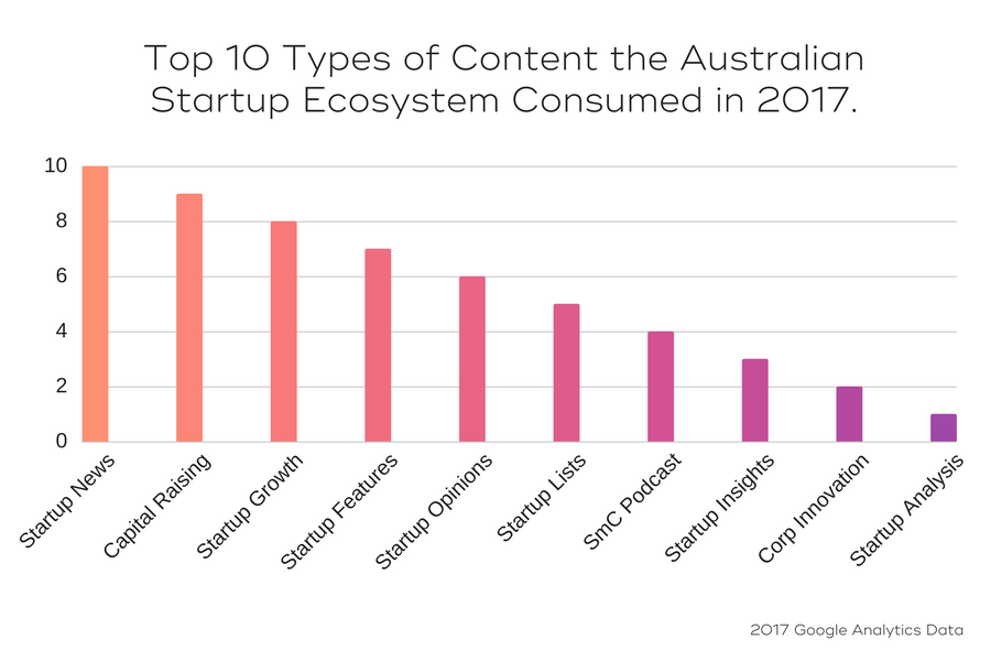 In 2017 the daily startup news, content on raising capital or recent funding rounds, and articles that explored growing a company, increasing sales and reaching profitability were the three key topics or content types that the Australian startup ecosystem clicked on, searched for, and engaged with most on Startup Daily.