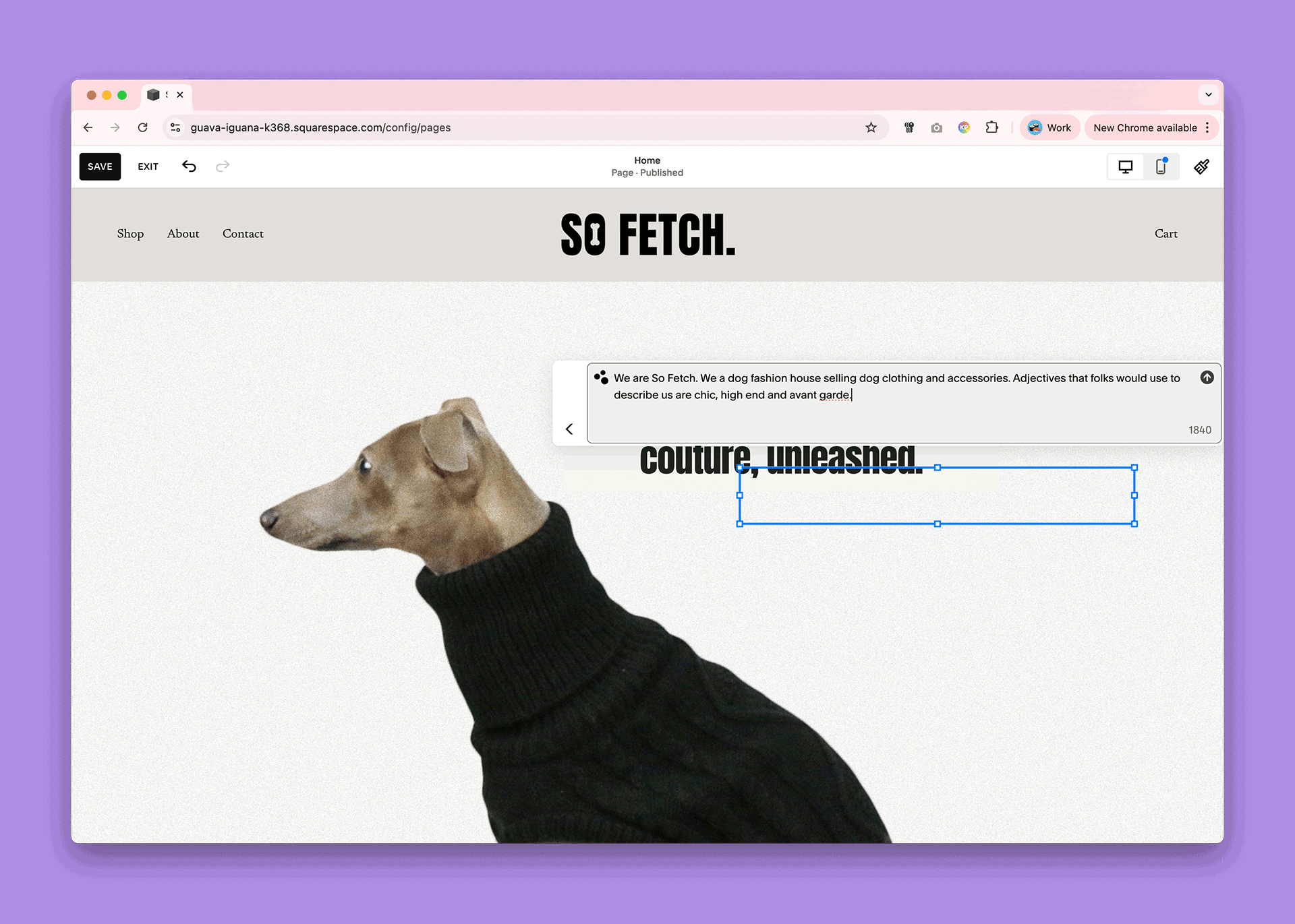 All you need to do is your business, your industry and your desired tone with an ‘ad lib’ – we adapted Squarespace’s AI prompt suggestion below from this: