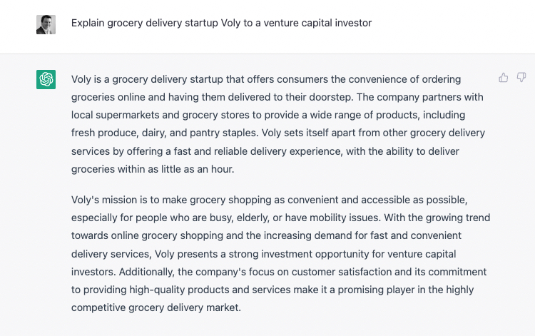 ChatGPT: Voly is a grocery delivery startup that leverages its network of local grocery stores, warehouses and suppliers to bring fresh, affordable groceries straight to consumers’ doorsteps. Customers can order their groceries online or through the Voly app and have them delivered at their convenience.