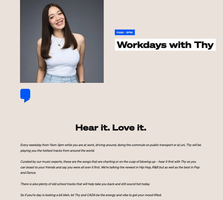 The fake presenter, “Thy”, has been generated reportedly using someone in the finance department at ARN. The show broadcasts on CADA – “Australia’s home of Hip Hop and R&B”, 11am-3pm, weekdays.