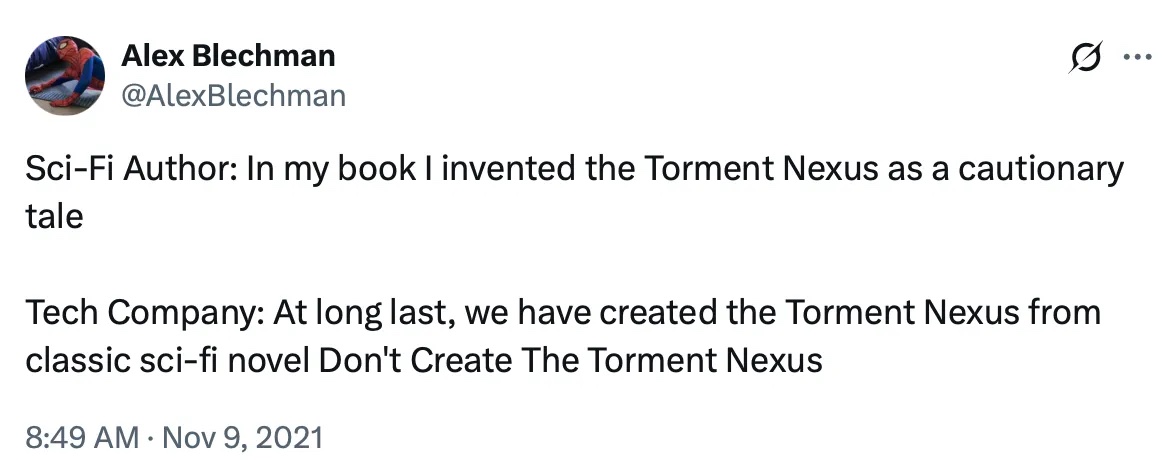 But perhaps the deepest suck of all is that the worst people in the world control it. It’s Zuck. It’s Elon. It’s the fanboys of the Torment Nexus.