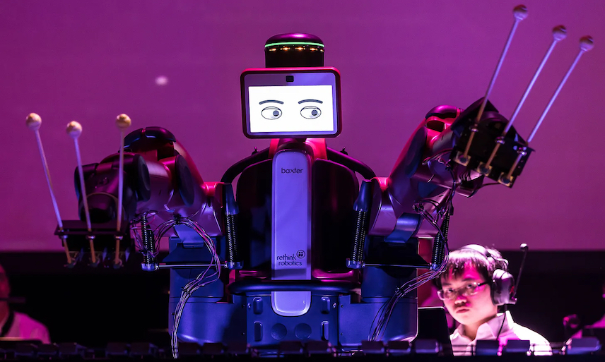 Baxter, the marimba-playing robot, didn’t just follow a programmed sequence. This wasn’t some player piano trick: Baxter actually improvised. In front of a live audience, this mechanical musician joined players in a 30-piece jazz orchestra, listening via midi files as it sat in their midst. Bax then processed the harmonic progressions in real-time and contributed melodic ideas that genuinely surprised everyone in the room – including me. He even played a solo!