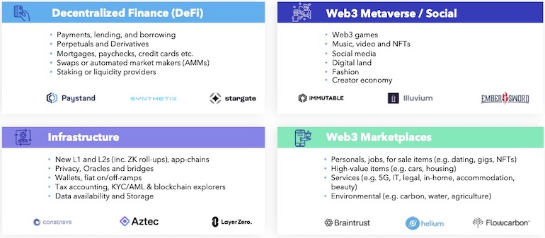 4) Infrastructure (aka “Web3 network architecture): The tooling and platforms to make all this work is still at the early stages of being deployed—enormous companies will be built solving the many key problems remaining to be solved such as secure wallets, privacy, blockchain bridging, scaling solutions and regulatory compliance.