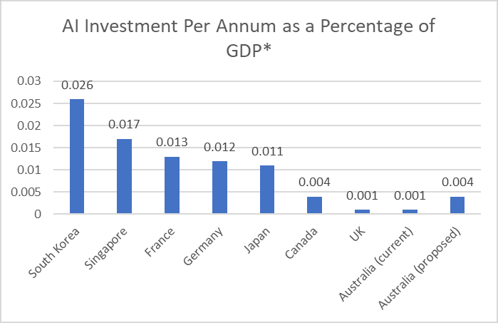 The AIML’s proposal is seeking $80 million over four years from the federal government, combined with , $50 million additional from industry and $20 million from universities to establish the centre, increasing Australia’s investment in AI to 0.004% of GDP, putting it on a par with Canada.