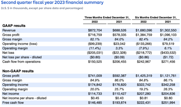 The company beat analysis revenue expectations with Q2 FY23 still growing by 27%, year-on-year, to US$872.7 million. The operating margin was (11)% for the quarter, compared with 3% for Q2 FY22.