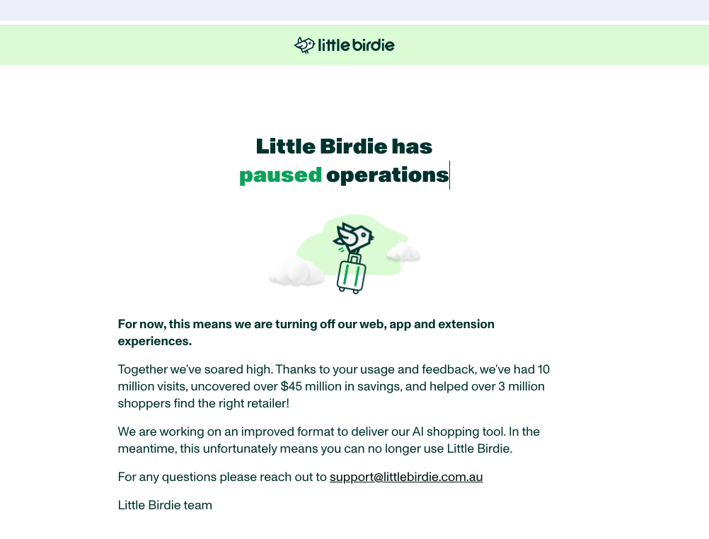 “We are working on an improved format to deliver our AI shopping tool. In the meantime, this unfortunately means you can no longer use Little Birdie.”