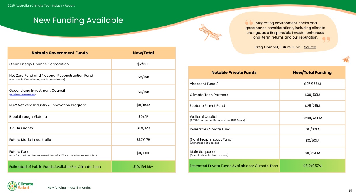 The report identified $10 billion in new public funding coming online in the last 18 months from the likes of the Future Made in Australia, ARENA, and the National Reconstruction Fund, amid $164 billion in potential investment. The private VC funds increased their capital pool by $310 million – almost 50% – amid $957m for climate tech. Leading that pack was Wollemi Capital, with $230 million committed by REST Super for a new fund.