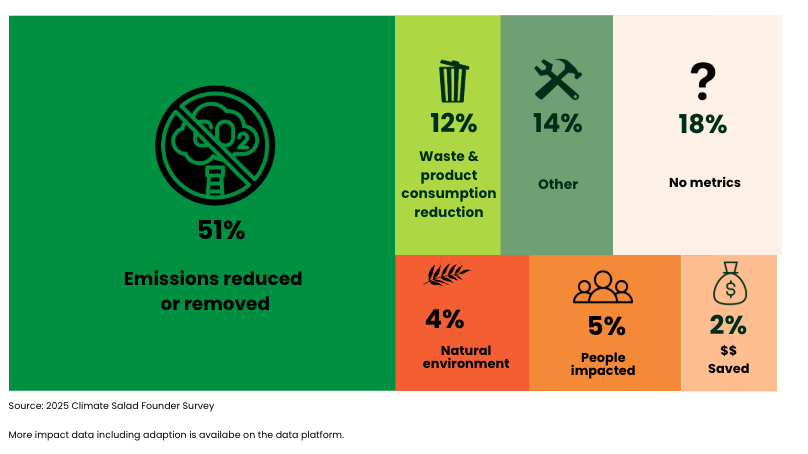 Emissions reduction or removal represents 51% of the impact by climate tech companies. Surprisingly, asking founders about their impact, 18% reported no impact metrics at all , which Climate Salad describes as a missed opportunity for credibility, funding, and alignment with emerging climate reporting standards.