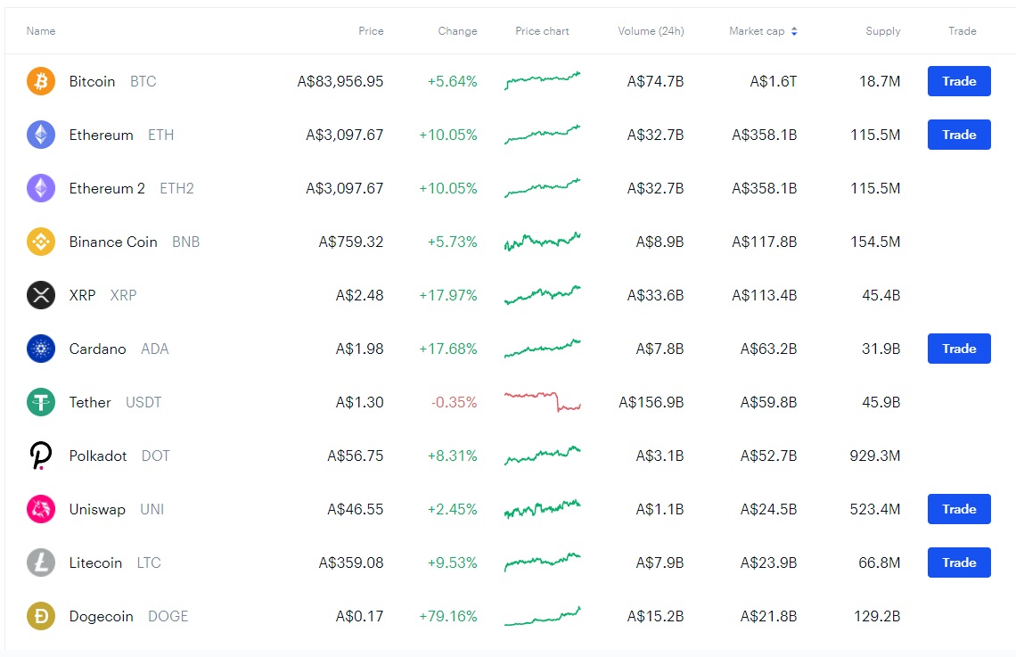 The outstanding performer of the last 24 hours has been the joke meme crypto Dogecoin, soaring nearly 80% to US$0.13 cents. It high a fresh all-time high of US11.5c around lunchtime today.