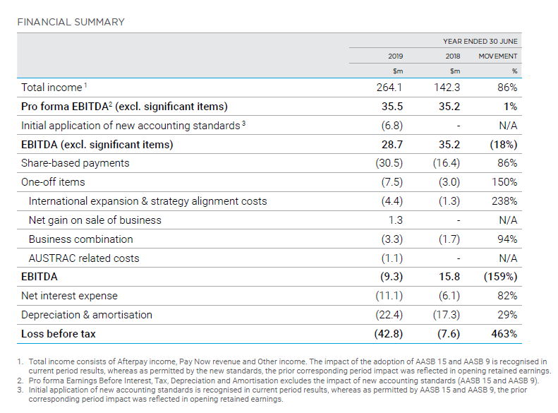 Afterpay’s FY19 financial summary