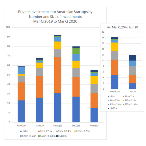 Startup sector analysts Techboard hve been monitoring Australian startup and tech sector growth since 2017 and the March quarter 2020 was the second highest in that time with A$1.75 billion in funding secured. That level is only surpassed by the March quarter last year at $2.739 billion, but that figure included the A$1.6bn PEXA acquisition, so this year has been strong ahead of covid-19’s sting.