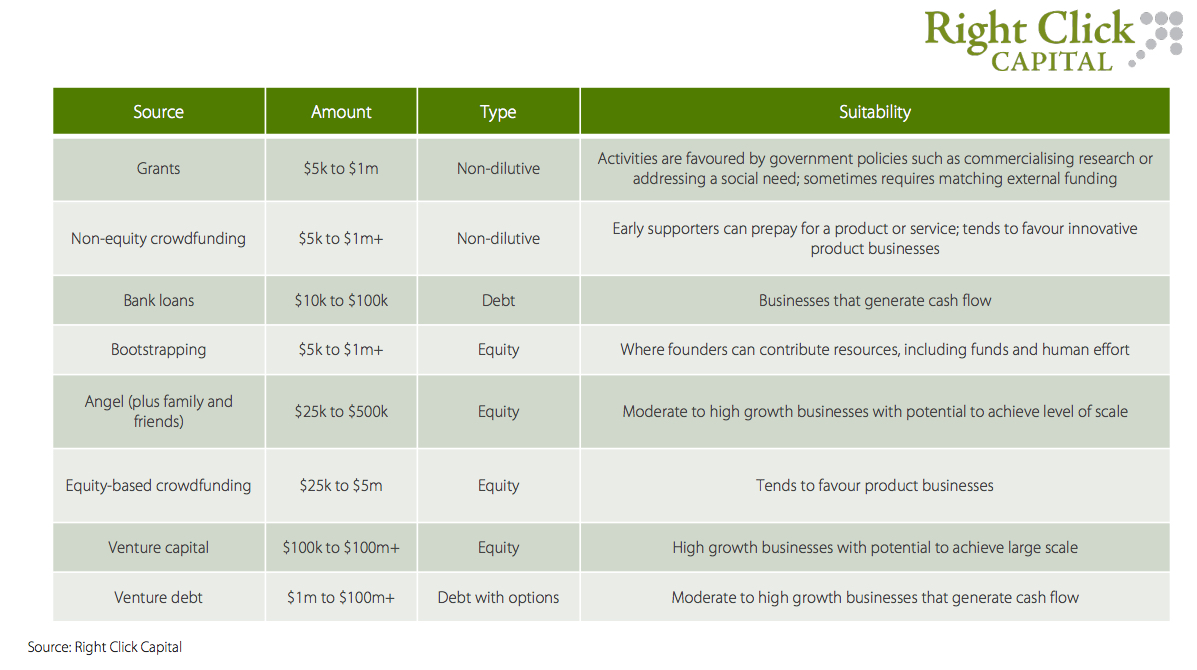 Competition is often fierce but for startups able to access some of the local, state and federal government grants made available to Australian startups, this can be a game changer. Grants have the advantage of being non-dilutive for the founders’ equity position, but they may require matched funding from other sources. Knowing another investor is on board, acts as validation for the government.