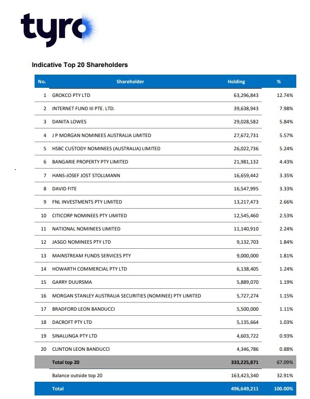 Here are Tyro’s top 20 shareholders.