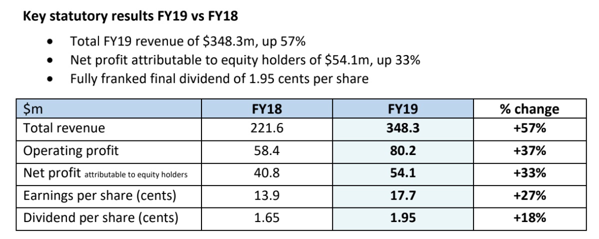The company is forecasting similar growth rates in FY20, with EBITDA predicted to increase 34-42% $145-153 million, with revenue increasing by 26-32% to $440-460 million.