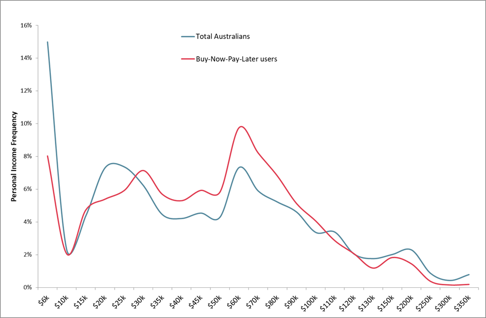 Roy Morgan found people aged 14-34 were 55.9% of BNPL users, with those aged 25-34 making up 33.5% of all users. The researchers concluded the 25-34 cohort is nearly twice as likely to use a BNPL system compared to the average across the whole nation.