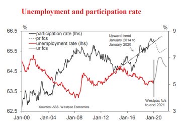 Westpac predicts 7% unemployment. The bank’s Macro team, led by economist Bill Evans, increased its estimates on the shock to consumer spending to hotels, restaurants and cafes,recreational services, and air travel to minus 40% over the two quarters from minus 25%; the expected shock to consumer durables to minus 7% and revised up the negative impact on home renovations and additions.