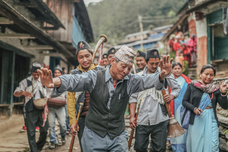 Thankyou co-founders Daniel and Justine Flynn in Nepal with locals and One Heart Executive Director, Surya Bhatta. Photo: Kim Landy.