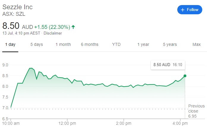 EDITOR’S NOTE: Sezzle closed the day up 22% at $8.50 with a rally in the last 30 minutes of trade that saw the fintech’s share price rise from $8 at 3.30pm. Afterpay finished the day down slightly at $71.74.
