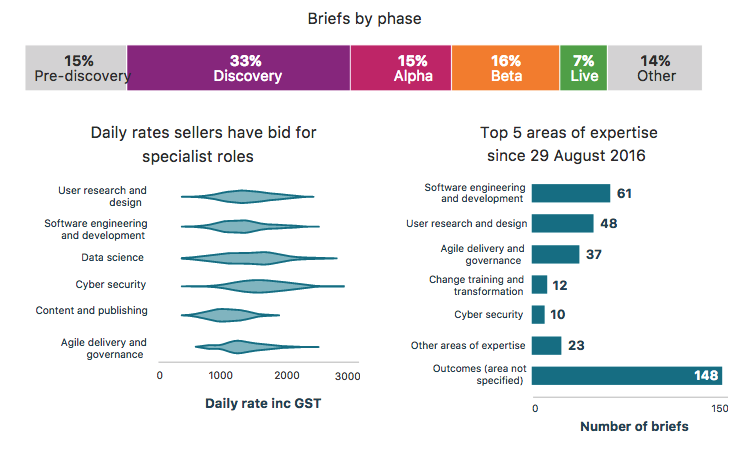 In looking at how the Marketplace breaks down procurement, 15 percent of briefs have been in the pre-discovery phase, 33 percent in discovery, 15 percent in alpha phase, 16 percent in beta, and 7 percent live.