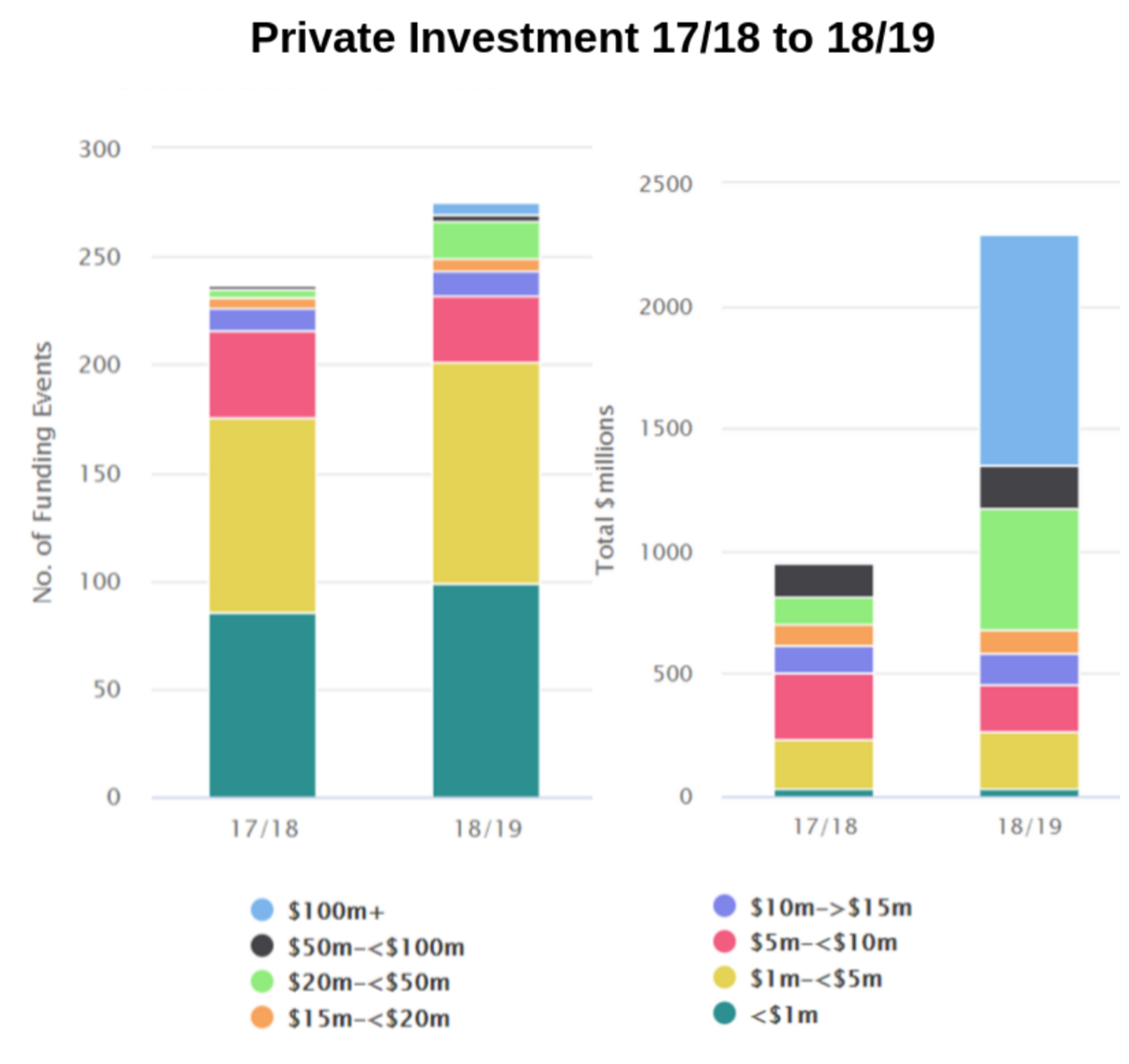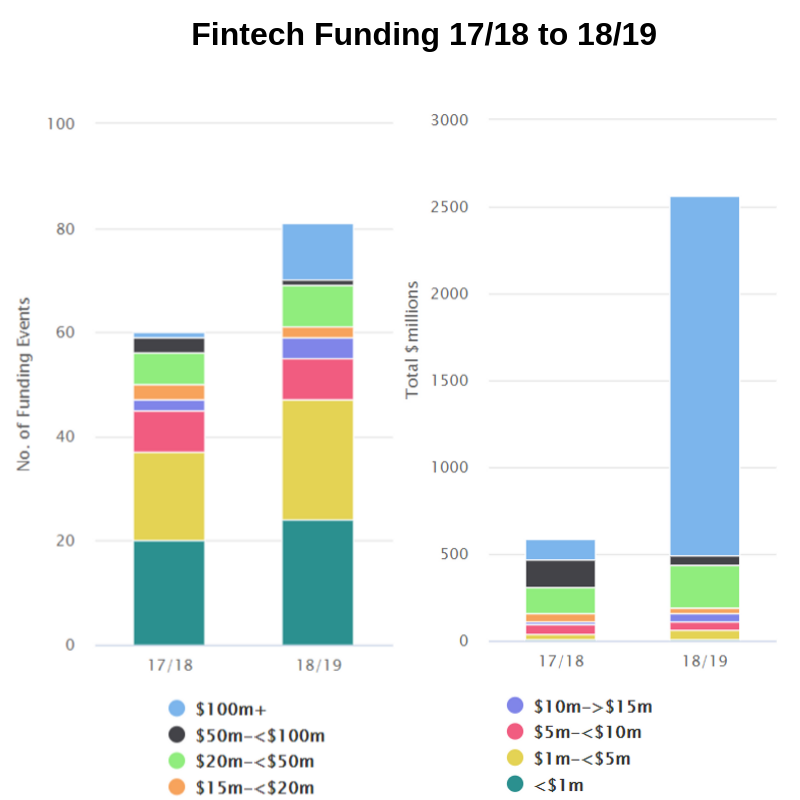 van Bruchem said a maturing of the sector meant funding rounds were generally getting larger as companies also matured. The biggest growth last financial year occurred in the number of funding events above $100 million, with their value up 235% from $1.237bn to $4.147bn in FY19.