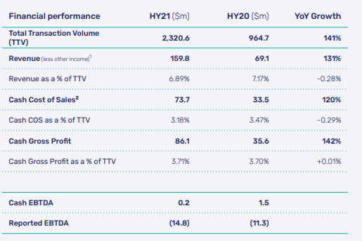 Revenue grew by 130% to $160 million in the six months to December 31, 2020. Total transaction value (TTV) was up 141% to $2.32 billion (annualising at $7.5bn+ as at Dec2020).