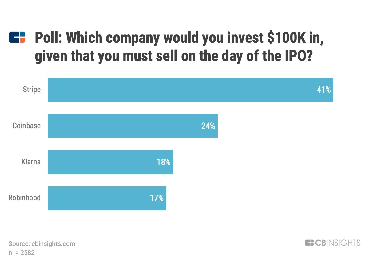 We liked this chart from the team at CB Insights. They asked readers last week, which of the following four fintech companies they’d put $100k into on the proviso they they had to offload the stock on the day of the IPO.